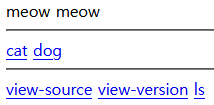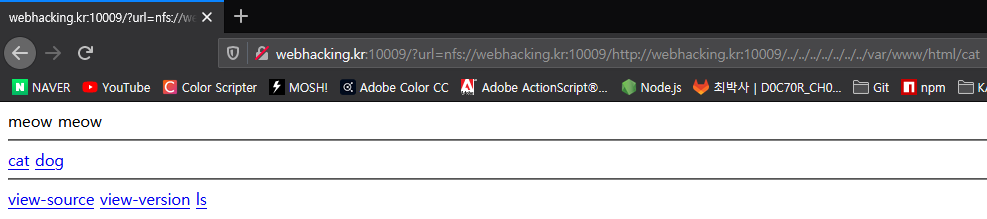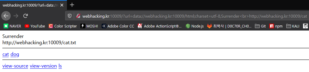 echo "<hr><a href=./?url=http://webhacking.kr:10009/cat>cat</a> <a href=./?url=http://webhacking.kr:10009/dog>dog</a> <hr><a href=./?view_source=1>view-source</a> <a href=./?view_version=1>view-version</a> <a href=./?ls=1>ls</a>";
