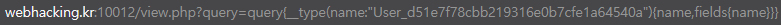 query{__type(name:"User_d51e7f78cbb219316e0b7cfe1a64540a"){name,fields{name}}}