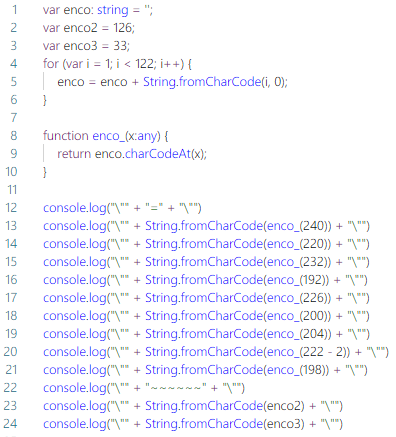 if (ck == "=" + String.fromCharCode(enco_(240)) + String.fromCharCode(enco_(220)) + String.fromCharCode(enco_(232)) + String.fromCharCode(enco_(192)) + String.fromCharCode(enco_(226)) + String.fromCharCode(enco_(200)) + String.fromCharCode(enco_(204)) + String.fromCharCode(enco_(222 - 2)) + String.fromCharCode(enco_(198)) + "~~~~~~" + String.fromCharCode(enco2) + String.fromCharCode(enco3)) {