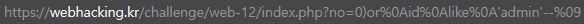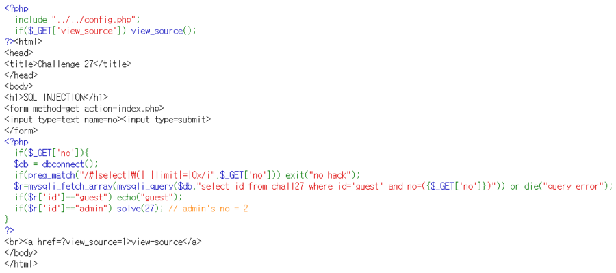 select id from chall27 where id='guest' and no=(0) or id like 'admin'-- )