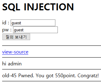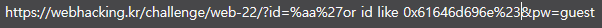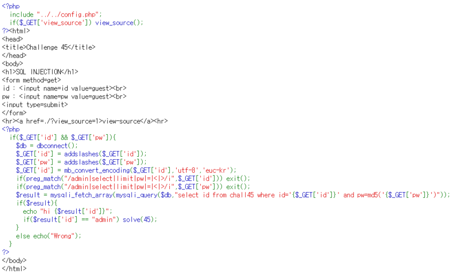 select id from chall45 where id=꩜' or id like 0x61646d696e#' and pw=md5('guest')