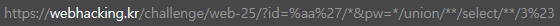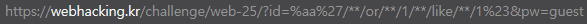 공백문자가 필터링되니 띄워쓰기를 /**/ 로 우회해서