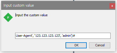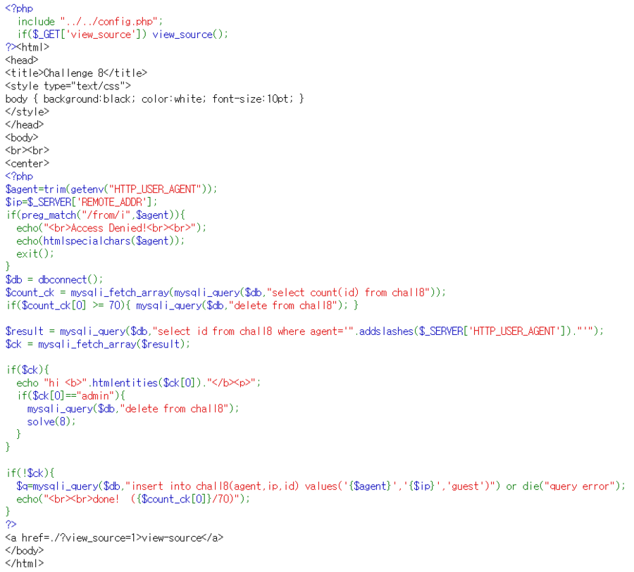 insert into chall8(agent, ip, id) value('User-Agent', '123.123.123.123', 'admin')#', '123.123.123.123', 'guest')
